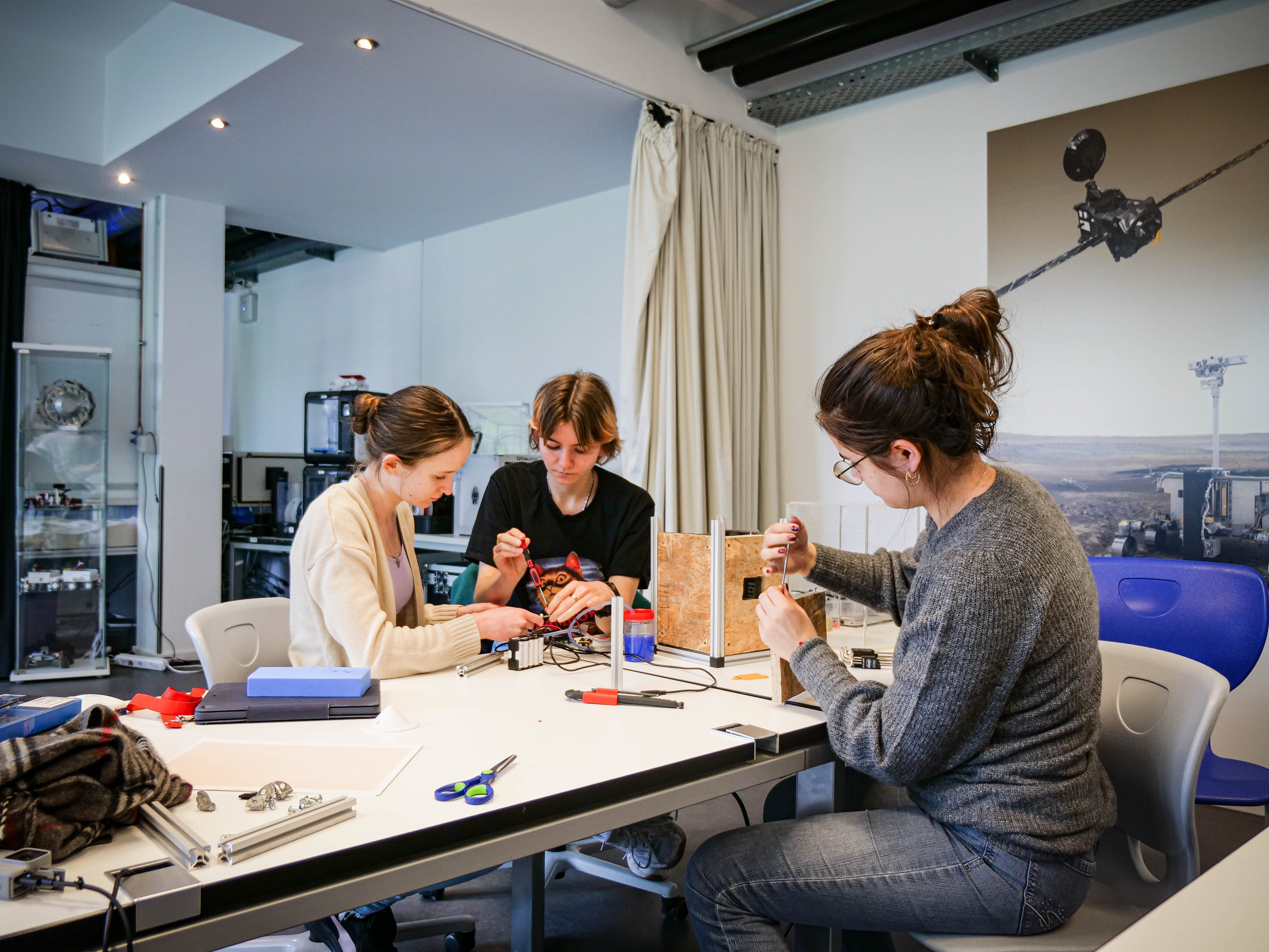 In einem zweiten Team haben sich vier Mädchen zusammengefunden, die sich bei der Sommerakademie 2022 der Universität Bremen kennenlernten. Sie kommen von Schulen aus Achim, Bremen Nord und dem Stadtteil Findorff. Die Entfernung zwischen den Orten war jedoch kein Hindernis ihr Projekt voranzubringen, entsprechend intensiv wurden dann an den Nachmittagen die Köpfe zusammengesteckt. Kernfrage ihres Experiments ist es, ob sich Wassertropfen mit akustischen Schallwellen in der Schwerelosigkeit ablenken lassen. Alles was sie dafür benötigen ist ein basslastiges Musikstück, ein leistungsfähiger Lautsprecher, ein Tropfsystem mit eingefärbter Flüssigkeit und High-Speed-Kameras, die alles im Detail aufzeichnen.