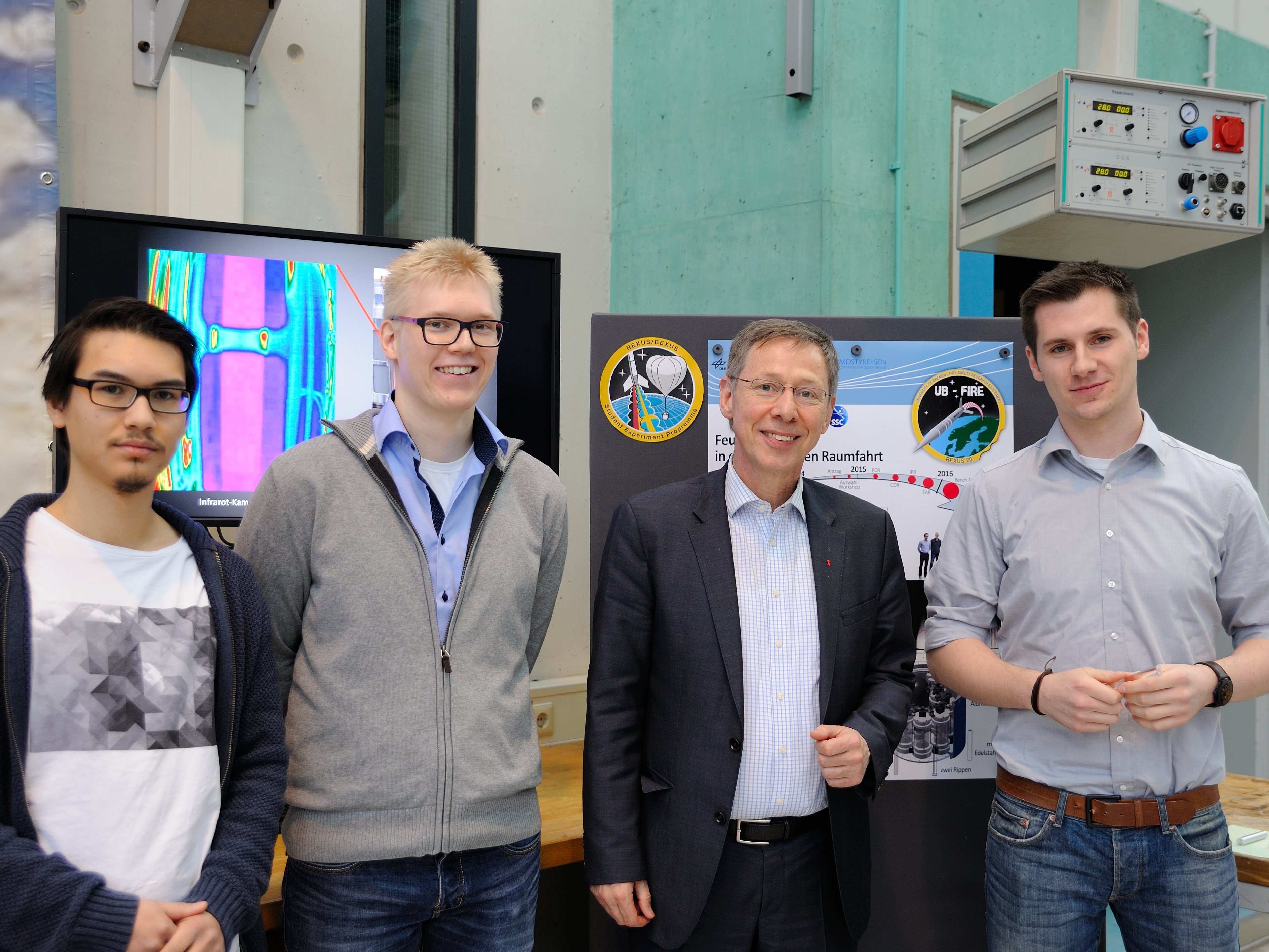Bei einem kleinen Rundgang gewann der Bürgermeister einen ganz konkreten Einblick, in die Nachwuchsförderung des ZARM. Ein Team von Studenten präsentierte ihr eigenes Experiment zu Mikrogravitation mit dem Thema Feuersicherheit in der bemannten Raumfahrt.