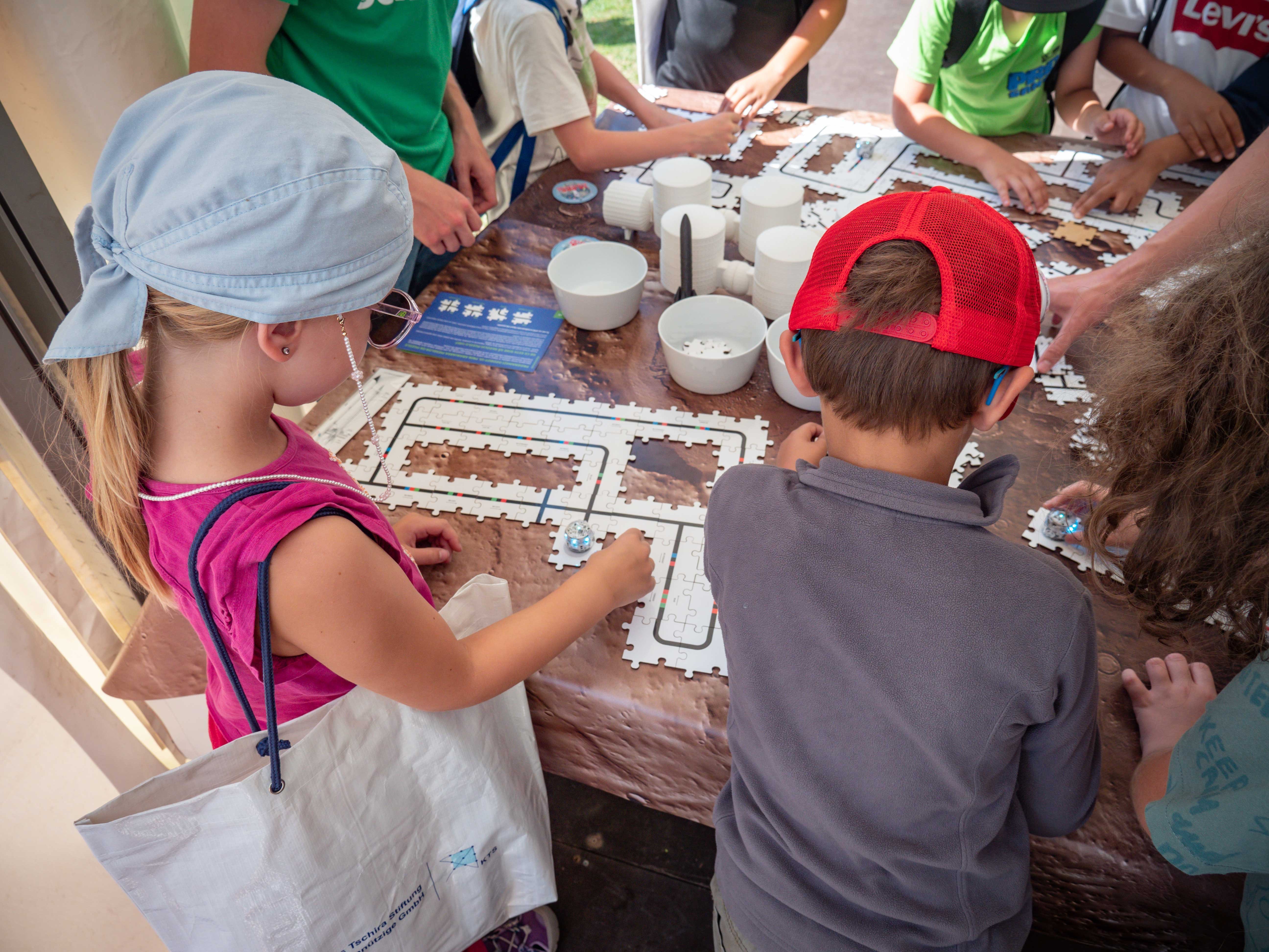 Mithilfe von VR-Brillen konnte an der Mitmachstation des ZARM ein Blick ins Innere einer Mars-Forschungsstation geworfen werden. Direkt daneben konnten die Kids eine von Kratern zerklüftete Marslandschaft mit Ozobot-Robotern erkunden. Spannend war für alle die Überlegung, ob man sich vorstellen könnte, auf dem Roten Planeten dauerhaft zu leben, der doch so anders ist als unsere lebenswerte Erde. Mindestens genauso überraschend war für die Kinder und Jugendlichen dann zu erfahren, dass wir vom kargen Mars tatsächlich für die Erde lernen können, nämlich wie wir Dank neuerster Technologien nachhaltig und effizient mit begrenzt vorhanden oder gar weniger werdenden Rohstoffen umgehen könnten.