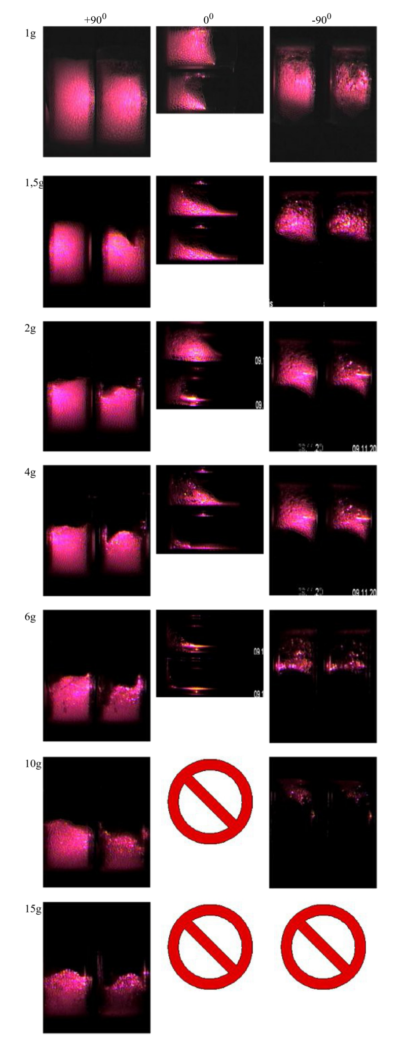 Foams were created at a constant gas flow rate for 10 seconds in different directions and at different gravity levels. Two images belong to each gravity level-foaming direction pair. The left one is the foam right after blowing up, and the right one is the foam three minutes after blowing up. The higher is the gravity level, the smaller is the achieved foam volume.