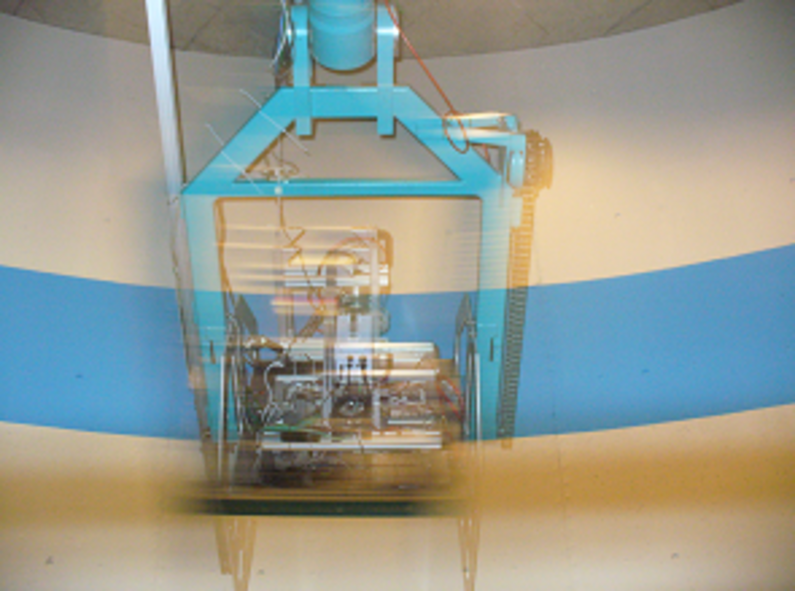 The experimental setup integrated in the centrifuge consists of a test cell, a liquid supply system, a gas supply system, an extraction system, a measurement and control system and an optical visualization system. The water spray is generated by an atomizer installed in the test cell. The droplets of the spray impact onto a convex heated target. The walls of the cell are transparent which allows observation of the spray impact leading to the formation of the liquid wall-film and generation of the secondary spray.