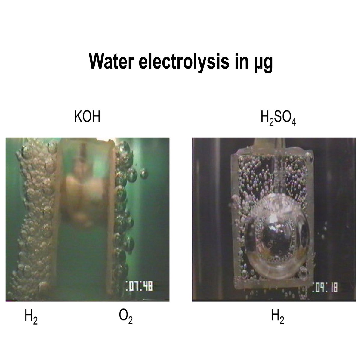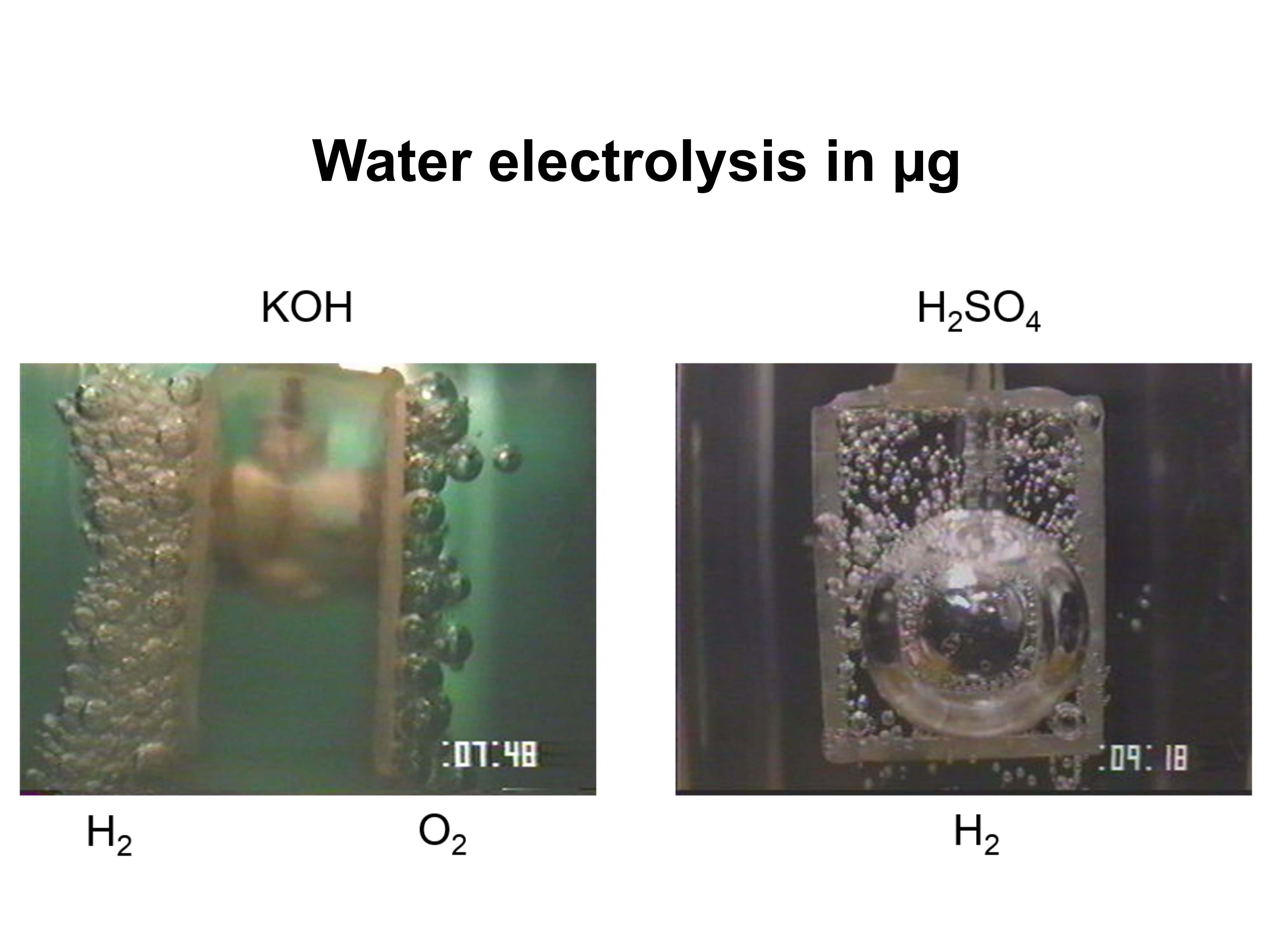 The use of hydrogen energy system is considered for lunar bases. The electric energy by solar power is converted/stored as hydrogen gas via water electrolysis during daytime, then regenerated into electricity by fuel cells at night. Under normal gravity, buoyancy causes the generated gas to separate from the electrode surface naturally. However, under microgravity, bubbles cannot detach from the electrode surface. Consequently, electrolysis in space has drawbacks of high-power consumption. Therefore, it is necessary to in-situly observe and evaluate the characteristics of the bubbles generated during electrolysis.